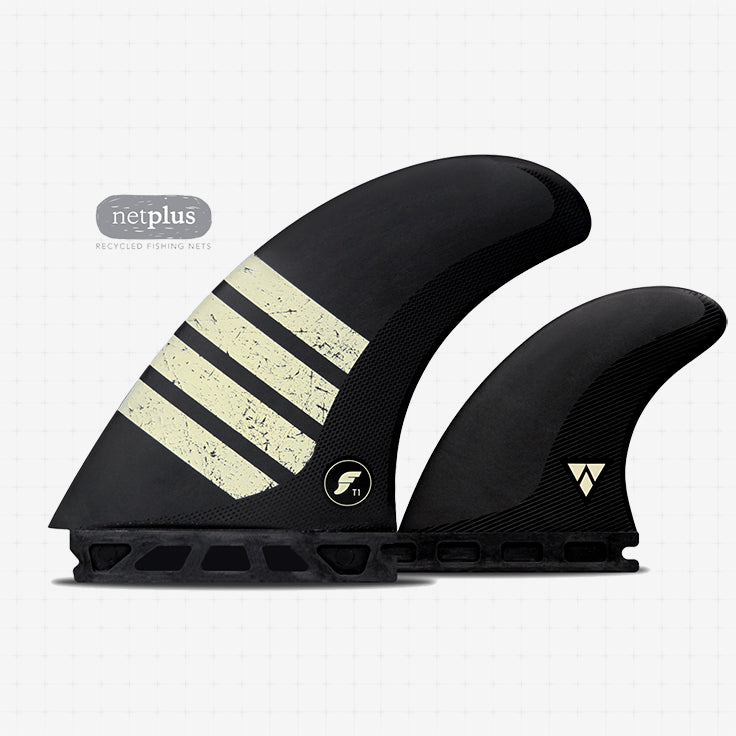 The T1 Alpha Twin +1 is Future's performance twin-fin designed for small wave, in the pocket surfing that modern twin-fins are becoming known for. Made in Huntington Beach, the Alpha product line now combines Bureo’s NetPlus recycled fishing nets with Futures’ Compound 6 carbon and air infused technology. This construction offers stability and control at top speed. The set is equipped with the option to ride with a small trailer fin for increased stability creating more of a thruster feel. Performs best with the Bonito and Bonito VS, trailer comes extra.